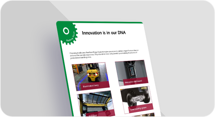 st Innovation is in our DNA i r f Safety Choosing to take your fleet from Briggs Equipment gives you access to a whole range of features that can enhance the operator experience. They also deliver clear safety benefts by considering the presence of pedestrians in working areas. Illuminated livery Interactive dashboard Sun visor Load stability system Indoor deceleration sensor Laser positioning aid High intensity lighting Red zone lighting