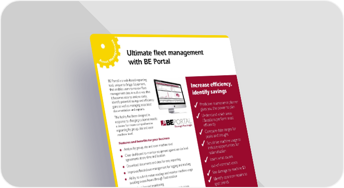 tne em ag Ultimate fleet management n Asset Ma with BE Portal BE Portal is a web-based reporting tool, unique to Briggs Equipment, that enables users to review fleet Increase efficiency, management data in such a way that it becomes easy to analyse costs, identify savings identify potential savings and efficiency gains as well as managing associated Predictive maintenance planner documentation and reports. This facility has been designed in gives you the power to plan response to changing customer needs; Understand which areas a desire for more comprehensive PORTAL / locations perform most reporting by group, site and even Thorough Fleet Insight efficiently machine level. Features and benefits for your business Compare date ranges for PORTAL peaks and troughs Analyse by group, site and even machine level Thorough Fleet Insight Clear dashboard to monitor equipment against service level Scrutinise machine usage to agreements at any time and location indicate opportunities for PORTAL rationalisation Download documents and data for easy reporting Thorough Fleet Insight Learn what causes Improved breakdown management for logging and tracking Ability to submit meter readings and monitor machine usage out-of-contract costs avoiding excess hours through fleet rotation PORTAL Thorough Fleet Insight See damage by machine ID PM scheduling and monitoring Identify common repairs to Ability to identify trends and make informed decisions spot trends Total transparency of fleet for effective management Secure web based access; no telemetry device required Understand your operational costs BE in control